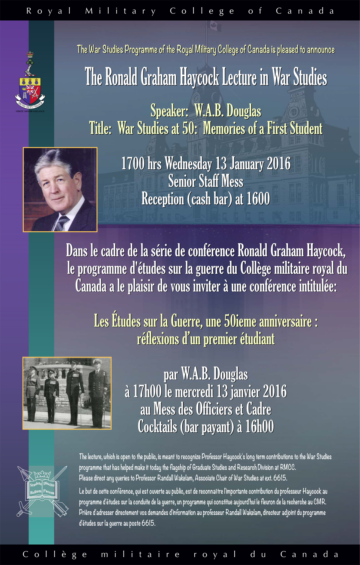 The lecture, which is open to the public, is meant to recognize Professor Haycock's long term contributions to the War Studies programme that has helped make it today the flagship of Graduate Studies and Research Division at RMCC.