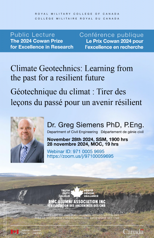 La rectrice Mme. Jill Scott, et la vice-rectrice à la recherche, Mme. Malardier-Jugroot, prennent grand plaisir d’inviter tous les professeurs, le personnel, les étudiants et les amis du CMR a une conférence publique par M. Greg Siemens – le gagnant du Prix Cowan 2024 pour l'excellence en recherche. Le titre de la conférence de « Géotechnique du climat : Tirer desleçons du passé pour un avenir résilient »